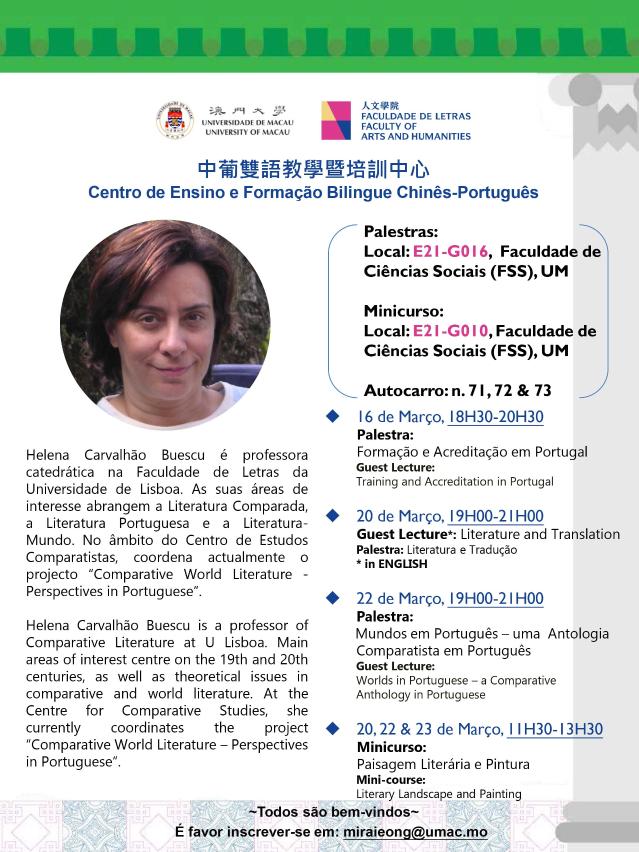 澳門大學中葡雙語教學暨培訓中心由三月起將定期舉行一系列推廣葡語學習的活動,率先上場的有名師講座,邀請到里斯本大學教授Helena Buescu於3月16日(星期五)到澳大,以“在葡萄牙的培訓及資格認證”為題進行演講,探討如何加強中葡雙語人才的培養工作。