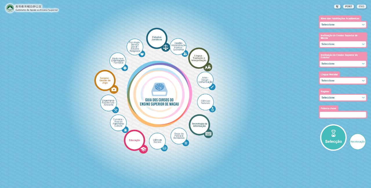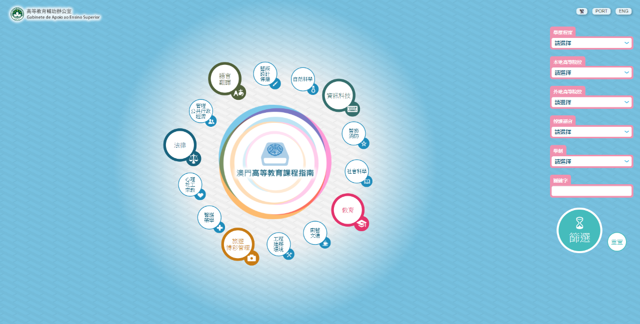 澳門高等教育課程指南網頁採用簡約清新的設計,設有中文、葡文和英文三種語言版本,展現本澳高等教育課程豐富多元的特點,同時設置多個搜尋功能,以配合不同人士的需要。網頁載有本澳十所高等院校以及外地機構在澳門開辦高教課程的詳細資訊,包括課程類別、專業設置、批核課程資料、報讀資訊、修讀科目等。