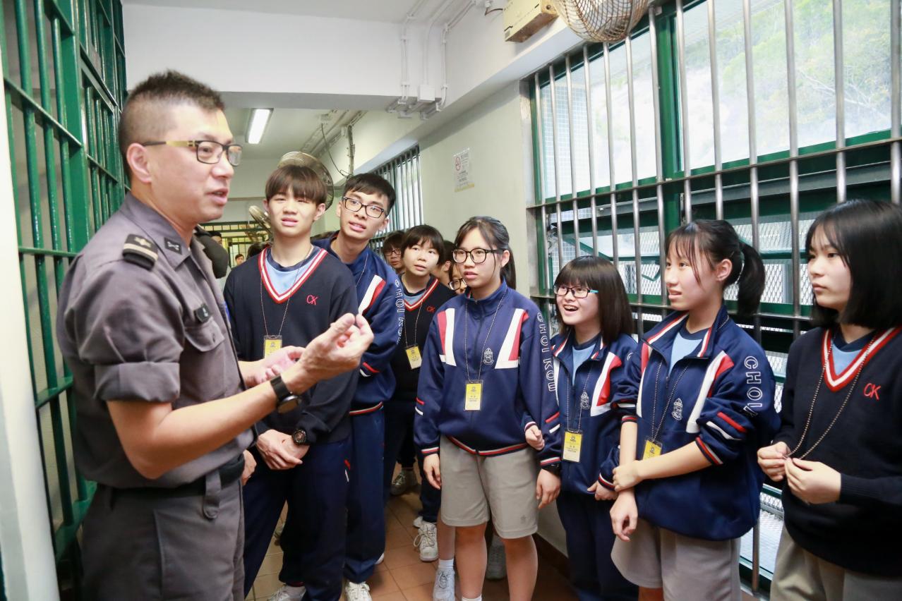 與此同時,學生們還登上了押解車輛,並到囚倉區參觀探訪室、囚室、課室及職業培訓工場等設施。此外,獄警向來訪學生展示各種執勤裝備,介紹不同設備的特性和用途,學生們踴躍試用手扣、警棍、胡椒噴霧、盾牌等裝備模型。