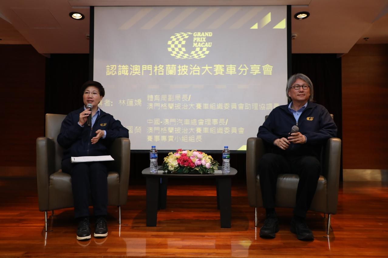 是次分享會活動的主講嘉賓包括:澳門格蘭披治大賽車組織委員會助理協調員林蓮嬌及秘書長李詩靈、賽事專責小組組長鍾國榮及成員李志良。