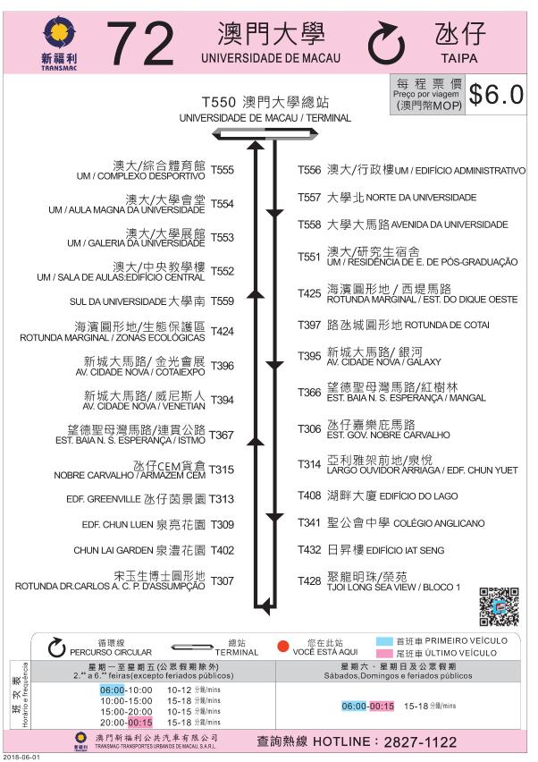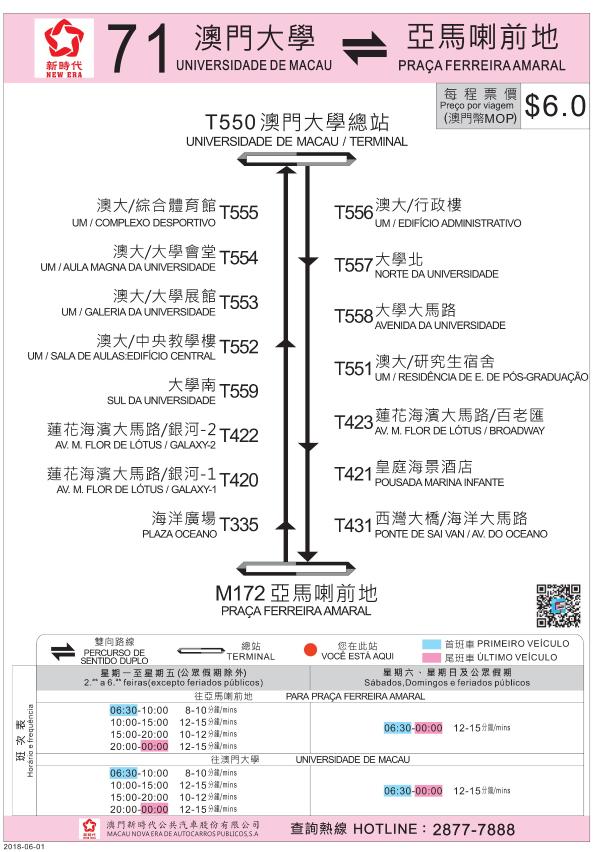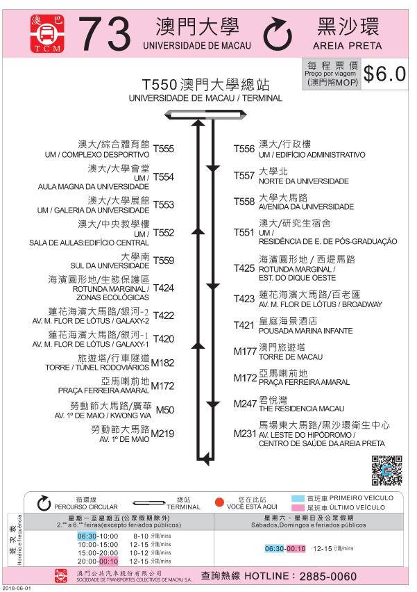 另外,經檢視過去客況數據,進入暑假後,前往澳門大學的71、72、73路線搭乘人次分別減少2至3成,有見及此,於6月1日(周五)首班車開始,73路線由平日8至12分鐘一班改為8至15分鐘一班;72路線由平日8至15分鐘一班改為10至18分鐘一班;71路線周一至周五的班次由8至12分鐘一班改為8至15分鐘一班;73X路線停駛,上述路線直至澳門大學新學年開學日恢復原班次服務。