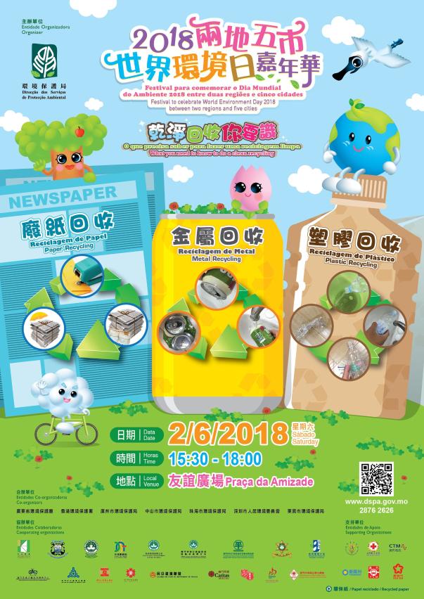 為響應一年一度的國際性環境保護節日──6月5日“世界環境日”,環境保護局聯合兩地五市環保部門於本周六(6月2日)下午三時半假友誼廣場舉辦“2018兩地五市世界環境日嘉年華”,活動主題為“乾淨回收你要識”。