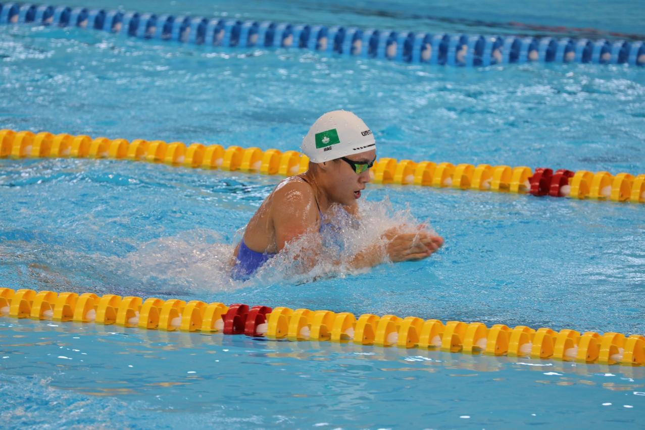 游泳進行了多項預賽,男子100米仰泳,任正文(YUM CHENG MAN)1分02秒63完成賽事;男子200米蝶泳,林思庄(LIN SIZHUANG)2分11秒16完成賽事;利安琪(LEI ON KEI)和鄭詠琳(CHEANG WENG LAM)於女子100米蛙泳,分別游出1分16秒06及1分15秒19的成績,上述四人均未能晉級。女子4x100米自由泳接力,利安琪、黃文慧(VONG ERICA MAN WAI)、龍子惠(LONG CHI WAI)及譚志欣(TAN CHI YAN)隊伍游出3分59秒49的成績,打破了澳門紀錄並晉級決賽 ,最後取得第8名兼破澳門紀錄。