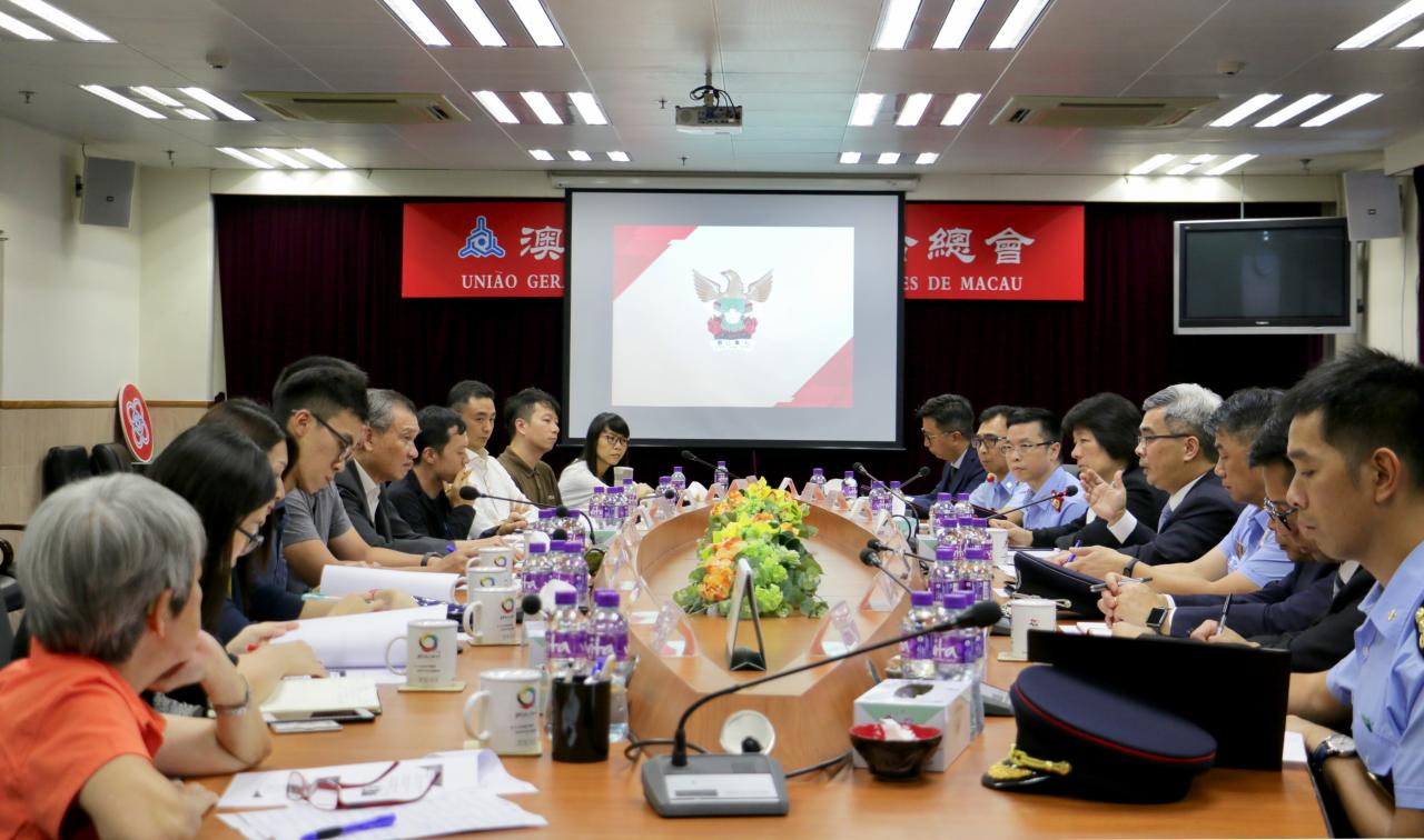 保安司司長黃少澤率領相關保安部隊及部門官員,今(22)日下午拜訪了澳門街坊會聯合總會,與該會監事長姚鴻明,副理事長兼秘書長莫偉成、副理事長兼青洲坊眾互助會理事長張捷、副理事長兼社會事務委員會主任陳家良、副理事長兼中區辦事處主任程順明、群力智庫中心副理事長雷民強和張淑玲,路環石排灣居民互助會理事長黃麗儀,青洲坊眾互助會副理事長陳鳳、離島區辦事處副主任張郁文和街總政策研究室副主任朱穎中等領導進行會晤,續就本澳危險品儲存倉的安全管理事宜進行解說。黃司長強調,特區政府定以負責任的態度跟進處理本澳危險品現時的存放和管理問題,確保社區和居民的安全。