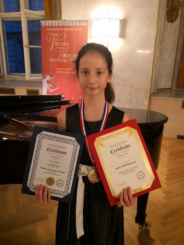 文化局演藝學院音樂學校普及課程 十一歲的大提琴學生伊露娜(Ilona Parent) 在奧地利維也納舉辦的Vienna Virtuoso Festival 2018音樂節暨國際音樂比賽中,技壓群雄,一舉奪得大提琴少年A組第一名並獲器樂組總決賽第一名,為澳增光。