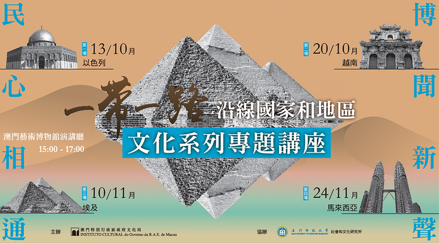 為增進市民對“一帶一路”沿線國家和地區歷史文化的瞭解,文化局與澳門科技大學社會和文化研究所將於十月至十一月期間舉行“博聞新聲 民心相通——一帶一路沿線國家和地區文化系列專題講座”。講座將於澳門藝術博物館演講廳以普通話進行,費用全免,座位有限,先到先得,歡迎有興趣人士報名參加。