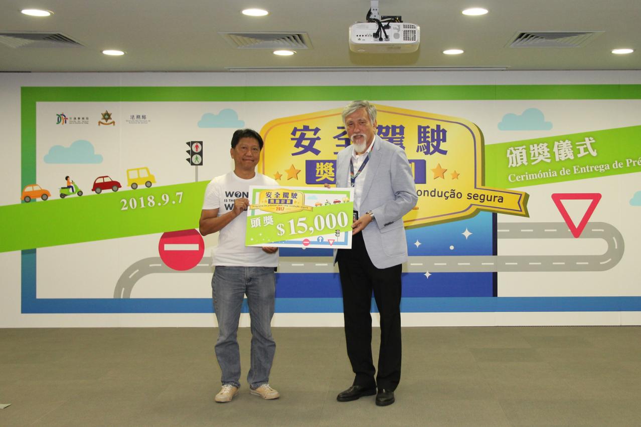 主辦單位於9月7日(周五)在交通事務局多功能廳舉行了「安全駕駛獎勵計劃2017」頒獎儀式,由交通事務局副局長賈靖龍、代副局長鄺偉卓;治安警察局交通廳代廳長李昶文、法務局法律推廣及公共關係廳廳長羅靜萍、教育暨青年局教育設備處處長黃超然、澳門街坊會聯合總會副理事長陸南德、澳門婦女聯合總會副理事長呂綺穎、工聯氹仔湖畔綜合服務中心幹事歐嘉輝及澳門學聯少年警訊活動委員會總監鄭健森,向頭三奬共九名得奬者頒發奬金,頭奬得主林艷馨可獲奬金15,000元,二奬得主梁永強、MAK CHI HUNG及ZHAO BAOXIN各得獎金8,000元,三奬得主季秋玲、關文雄、CHU KIN、LO PING SUM BENSUM及IU WAI IN各得獎金3,000元,餘下得獎者已於早前陸續領獎。