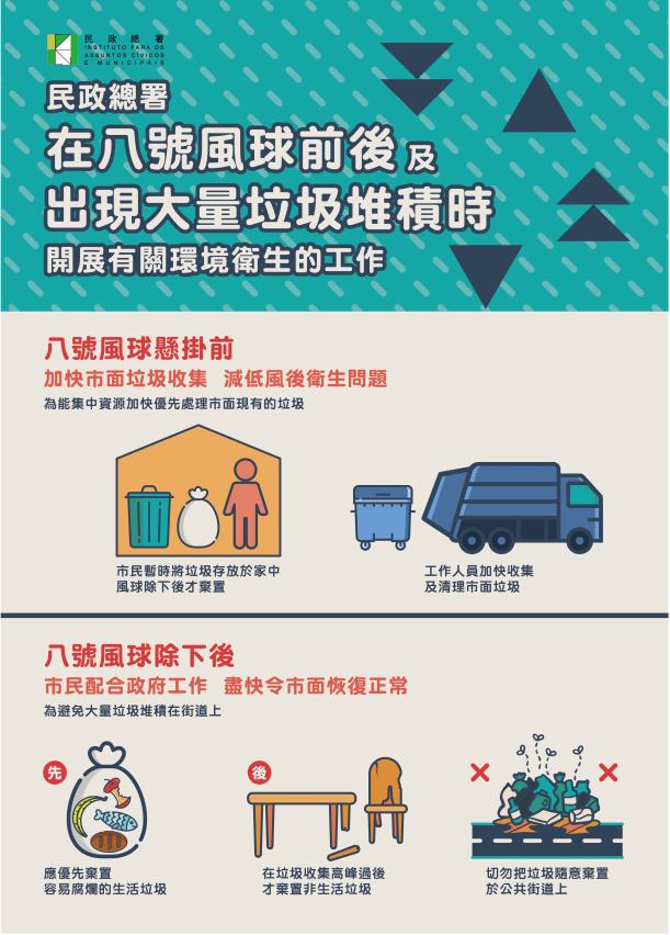 民署已協調清潔專營公司在八號風球懸掛前加快清運市面垃圾,避免颱風吹襲期間導致垃圾散亂在公共街道上,加重對環境衛生的影響。同時,為能快速及時進行清運,亦已協調清潔專營公司事先調配十輛工作車輛及六百個不同規格垃圾桶安置於澳門半島,並對水浸區壓縮桶進行加固確保安全。