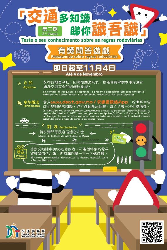 交通事務局推出第二期「交通多知識 睇你識吾識」有獎問答遊戲,即日至11月4日,市民可登入交通事務局網頁www.dsat.gov.mo或交通資訊站手機應用程式(App)填寫答案及報名,答對所有問題又被袖中者,可獲內附澳門幣100元之特別版電子貨幣儲值咭一張,得獎名額50名,歡迎踴躍參與。