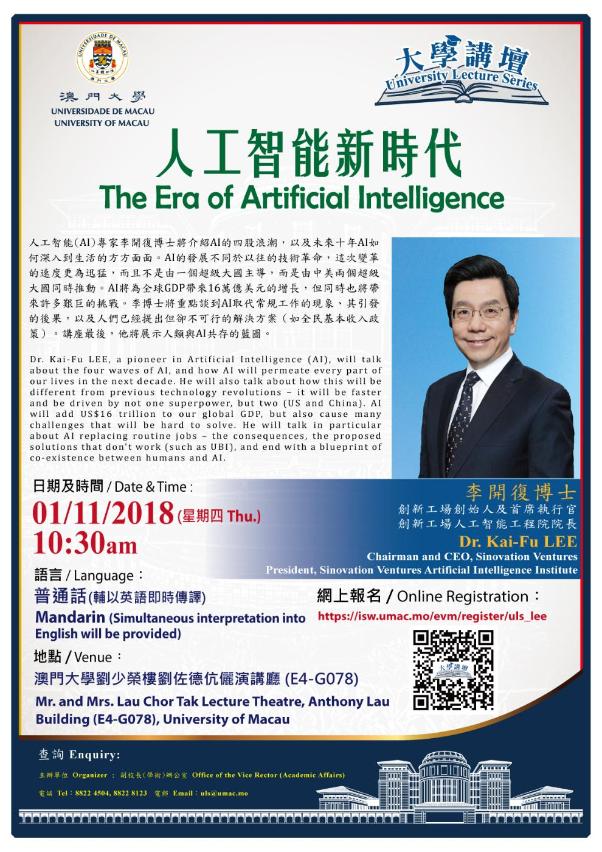 澳門大學將於11月1日(下週四)舉行“大學講壇”講座,邀請了創新工場創始人及首席執行官、創新工場人工智能工程院院長李開復擔任主講,就題為“人工智能新時代”發表演說,探討人工智能(AI)的四股浪潮,以及未來十年AI如何深入到生活的方方面面。歡迎有興趣人士參加。