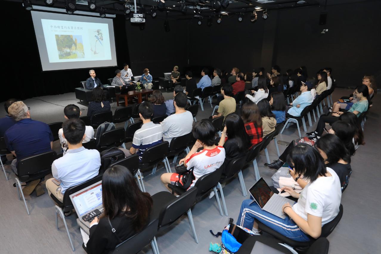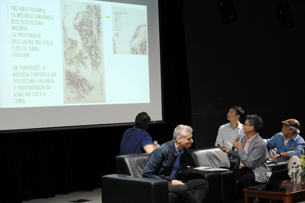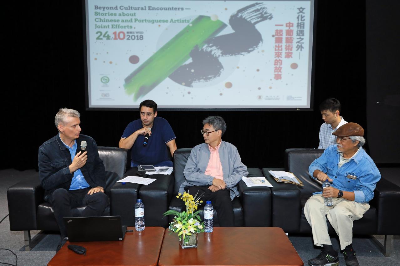梁煜輝首先介紹國畫署名與落款慣例的一些知識,並提出他與André Aveline António等藝術家在這慣例中摸索出來的“西文題字"的藝術遊戲。André Aveline António接著以具體畫作為例,介紹在國畫上用葡文與義大利文落款的創新實驗。他還分享他在藝術之外的“中葡交融"的經驗與趣聞。旅居澳門的葡萄牙建築師、畫家Gonçalo Cardoso de Menezes以他的人面神獸系列畫作為例,解釋他如何將中國神話故事裡的動物圖像、澳門寺廟香爐上的神獸、門口的獅子石像等融入西方人面神獸的繪畫中。