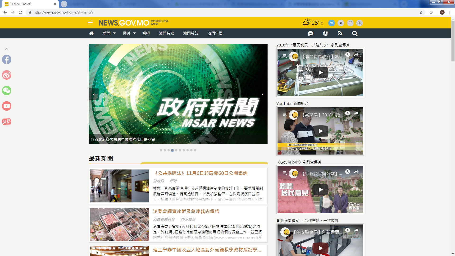 公眾還可經新網站連接到新聞局在不同社交媒體、新媒體平台的專頁、公眾帳號、專屬頻道,包括:臉書(Facebook)專頁、微信、新浪微博帳號、Youtube頻道、今日頭條“走近澳門”主頁等,選擇自己喜愛的方式獲取網上資訊。