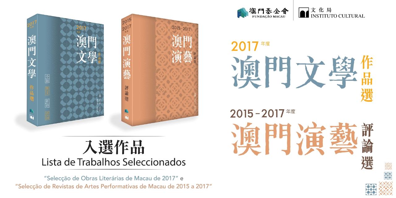 由澳門基金會及文化局聯合出版的《二零一七年度澳門文學作品選》及《二零一五至二零一七年度澳門演藝評論選》,將於十一月十七日(星期六)下午五時三十分假澳門塔石體育館“二零一八秋季書香文化節”會場舉行新書發行儀式。《二零一七年度澳門文學作品選》由廖子馨、吳淑鈿、盧傑樺及黃坤堯主編,共收錄小說十五篇、散文三十篇、新詩二十首及詩詞四十首。《二零一五至二零一七年度澳門演藝評論選》由周凡夫及莫兆忠主編,“本地作者卷”共收錄評論五十八篇、“外地作者卷”共收錄評論二十六篇。入選名單可於澳門基金會網頁(www.fmac.org.mo)及文化局網頁(www.icm.gov.mo)瀏覽,主辦單位將專函通知入選作者。