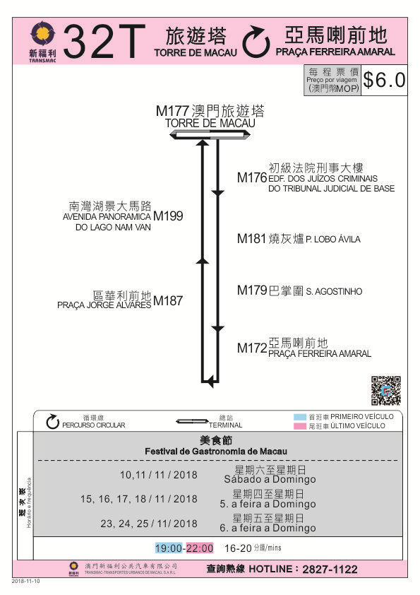 因應周末及大賽車期間為美食節的人流高峰期,交通事務局於11月10日(周六)至11日(周日)、15日(周四)至18日(周日)、23日(周五)至25日(周日)晚上臨時開通32T路線,連接旅遊塔至亞馬喇前地,以疏導大量客流及方便公眾轉乘。呼籲乘客留意。