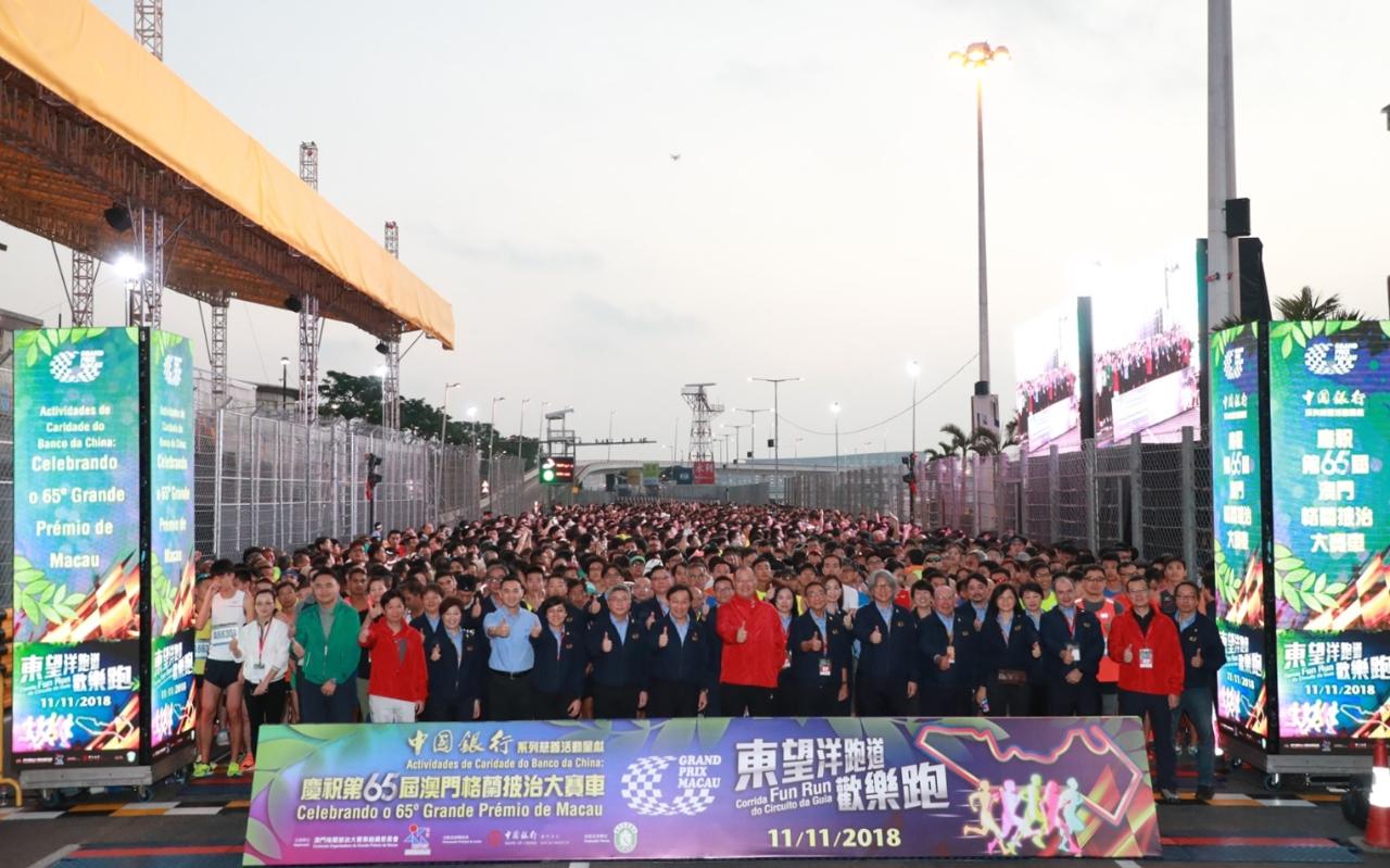 活動起跑前由社會文化司司長及澳門格蘭披治大賽車組織委員會主席譚俊榮、體育局局長及澳門格蘭披治大賽車組織委員會協調員潘永權及中國銀行澳門分行行長李光,一同鳴笛主持起步儀式。是次歡樂跑將體育及慈善的元素相結合,一眾參加者沿東望洋跑道角逐6.2公里競賽,跑向水塘北角彎、文華東方彎及葡京彎,並沿松山上路進發,以跑步的方式體驗這條歷史悠久、世界聞名的東望洋跑道,近距離感受澳門格蘭披治大賽車競賽的氣氛,歡欣迎接即將舉行的第65屆澳門格蘭披治大賽車。