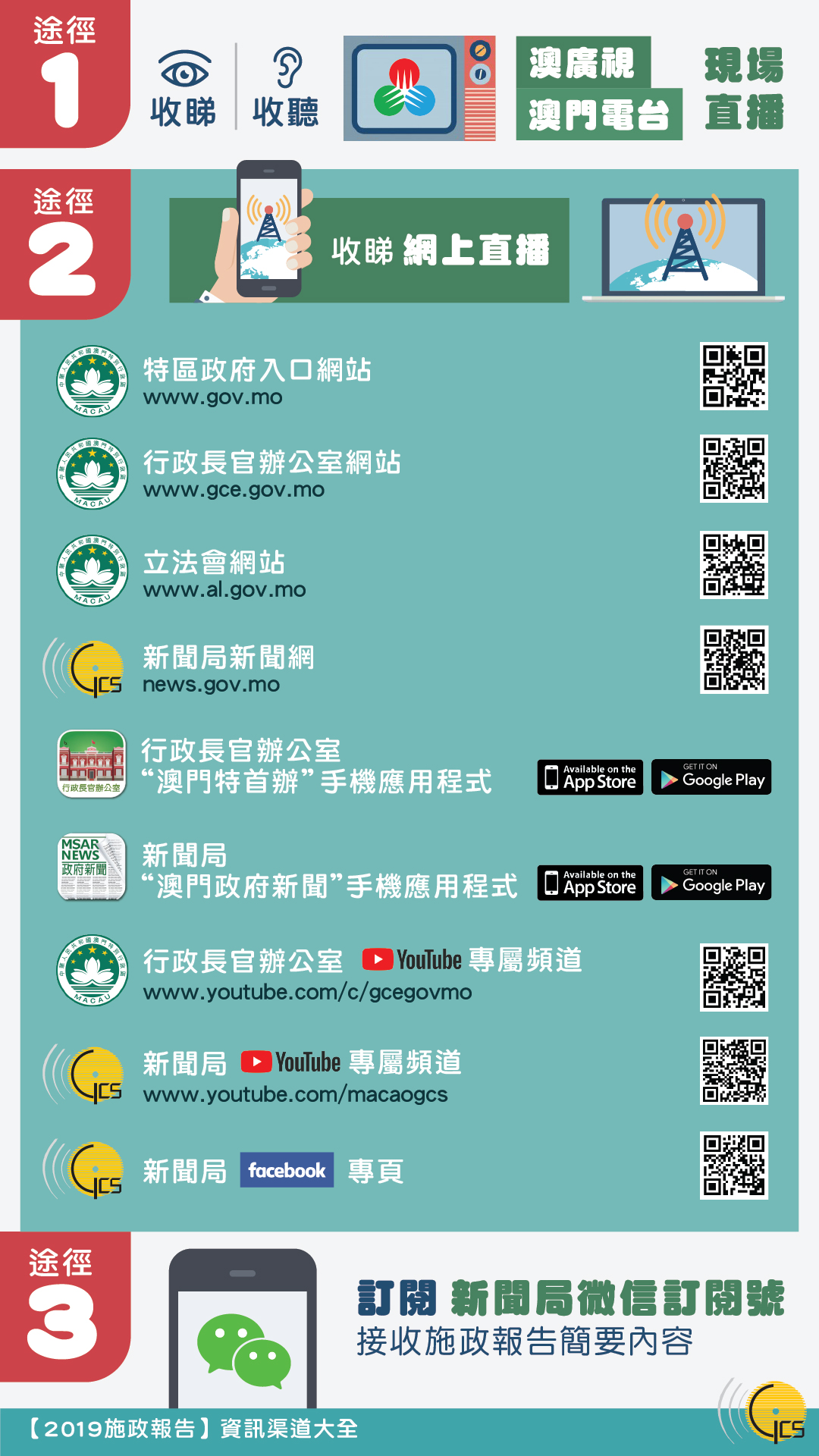 澳廣視屬下電視台的澳視澳門、澳門資訊、澳門-Macau衛星電視頻道,以及電台,將會現場直播施政報告發表情況、記者會及16日的立法會答問大會。公眾亦可透過以下途徑收看網上直播:澳門特別行政區政府入口網站(www.gov.mo)、行政長官辦公室網站(www.gce.gov.mo)、立法會網站(www.al.gov.mo)、新聞局網站(www.news.gov.mo);行政長官辦公室“澳門特首辦”手機應用程式、新聞局“澳門政府新聞”手機應用程式;行政長官辦公室Youtube專屬頻道(www.youtube.com/c/gcegovmo)、新聞局Youtube專屬頻道(www.youtube.com/macaogcs),以及澳門特區政府新聞局Facebook。