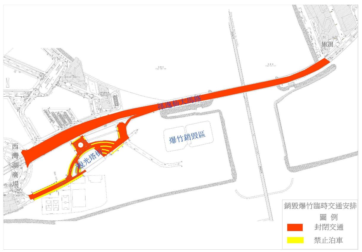 當中,2月4日(年三十)上午9時至10日(年初六)中午12時燃放區開放期間,觀光塔街近臨時巴士停泊區的路段封閉交通,孫逸仙大馬路近觀光塔街設置臨時的士站,以方便市民和旅客前往燃放區;而2月10日(年初六)及11日(初七)每日上午9時至中午12時,觀光塔街及介乎美高梅酒店與西灣湖廣場之間一段孫逸仙大馬路封閉交通,以進行爆竹銷毁工作。