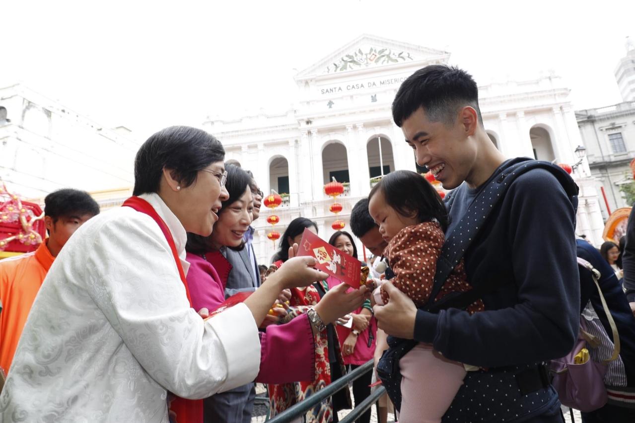 旅遊局局長文綺華、市政署市政管理委員會主席戴祖義、文化局局長穆欣欣、旅遊局副局長程衛東及許耀明,以及業界代表等,於大年初一早上在大三巴牌坊前主持金龍和醒獅點睛儀式,嘉賓們及後在議事亭前地燃放炮竹,並聯同財神爺在議事亭前地向市民和旅客派“利是”和金元寶,現場洋溢着新春喜氣,祝福聲連連,尤其在財神爺手中接過“利是”,寓意澳門繁榮興旺、財源廣進。澳門旅遊吉祥物“麥麥”亦與市民及旅客拜年,深受小朋友歡迎。