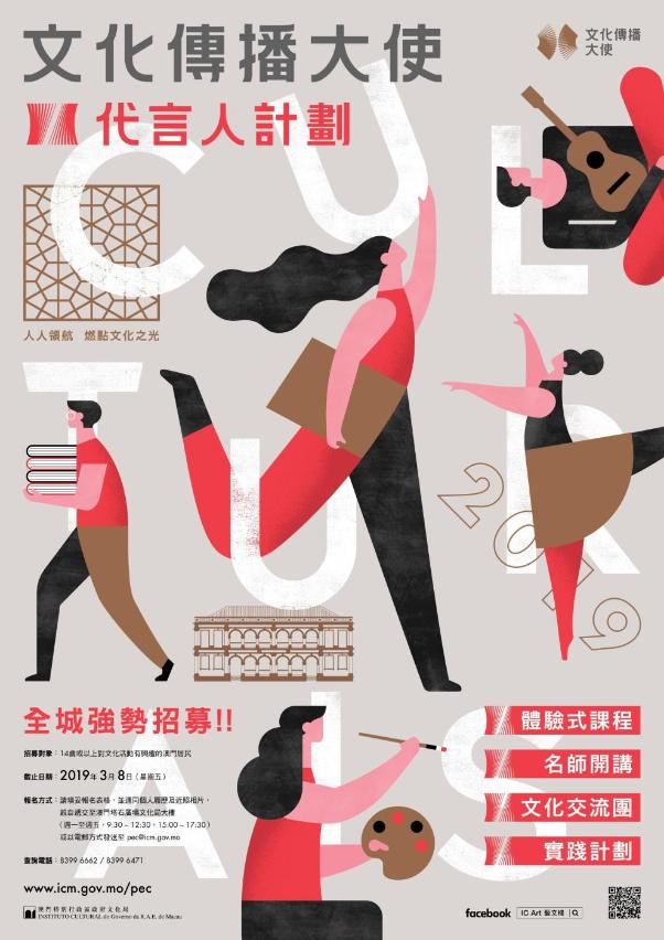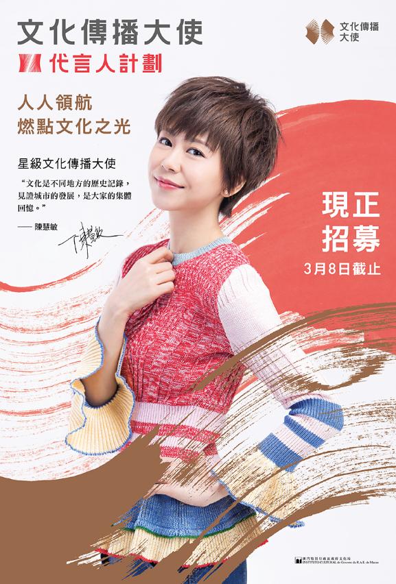 由文化局主辦的“文化傳播大使”代言人計劃現正招募學員,資深澳門歌手小肥及陳慧敏將擔任澳門地區“星級文化傳播大使”,與學員一起肩負推廣澳門的文化知識和人文理念,積極傳承及傳播澳門文化的使命。“文化傳播大使”代言人計劃提供一系列傳承中華傳統及澳門歷史文化知識,培養文化鑑賞及傳播技巧的課程,歡迎14歲或以上、熱愛文化藝術的澳門居民踴躍參與,報名日期由即日起至3月8日。
