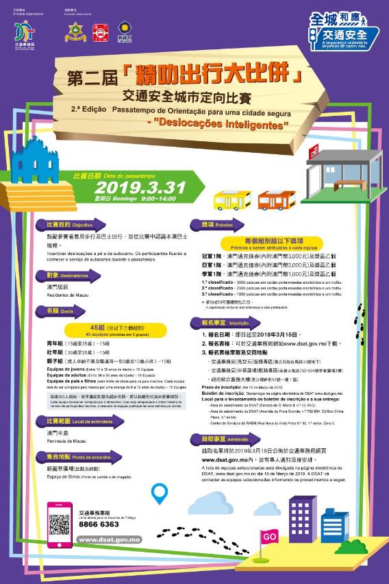 第二屆「精叻出行大比併」交通安全城市定向比賽將於3月31日(周日)上午9時至下午2假新麗華廣場舉行,各組設有冠亞季軍,分別可獲得奬盃及價值澳門幣3,000元、2,000元或1,000元的澳門通充值劵外,所有參賽者均可獲得精美禮物包。詳情可瀏覽交通事務局網頁(www.dsat.gov.mo)或致電交通事務專線88666363查詢。