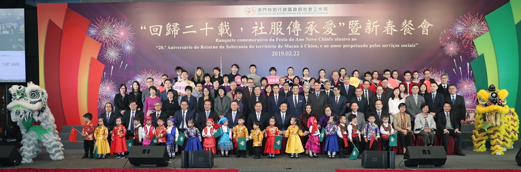 “回歸二十載,社服傳承愛”暨新春餐會中午12時於澳門旅遊塔會展娛樂中心四樓舉行,社會文化司譚俊榮司長、中聯辦副秘書長兼社會工作部黃華蓋部長、社會工作局黃艷梅局長、韓衛副局長、許華寶副局長聯同社會服務機構代表主持啟動儀式。會上,社會文化司司長辦公室葉炳權主任、全國人大代表、同善堂副主席及立法會議員崔世平,前全國人大代表及澳門街坊會聯合總會監事長姚鴻明,全國政協委員、澳門婦女及兒童事務委員會委員、澳門婦女聯合總會及母親會會長賀定一,全國政協委員、澳門工會聯合總會會長陳錦鳴,立法會議員梁孫旭、立法會議員馮家超,教育暨青年局老柏生局長、旅遊局文綺華局長、社會保障基金行政管理委員會容光耀主席、郵電局劉惠明局長、警察總局羅偉業局長助理、建設發展辦公室林煒浩主任等嘉賓,以及數百名本澳社會服務機構主管人員蒞臨餐會,歡聚一堂。