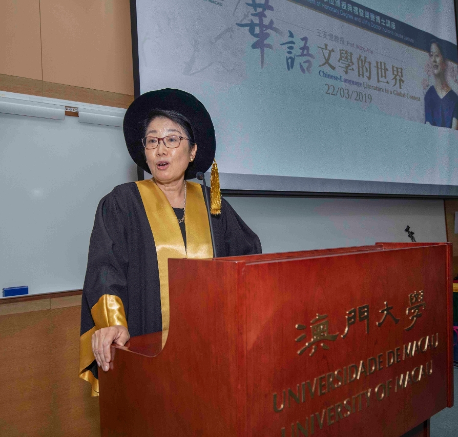 澳門大學今(22)日向當代中國著名作家王安憶授予榮譽文學博士學位,以表彰其對世界漢語文壇作出的傑出貢獻。同場,王安憶還主講了“華語文學的世界”榮譽博士講座,吸引眾多澳大和澳門中學師生、文化界人士及社會賢達參與,傾聽王安憶分享現代華語文學的淵源和特點,以及當代華語文學在全球化環境的發展。