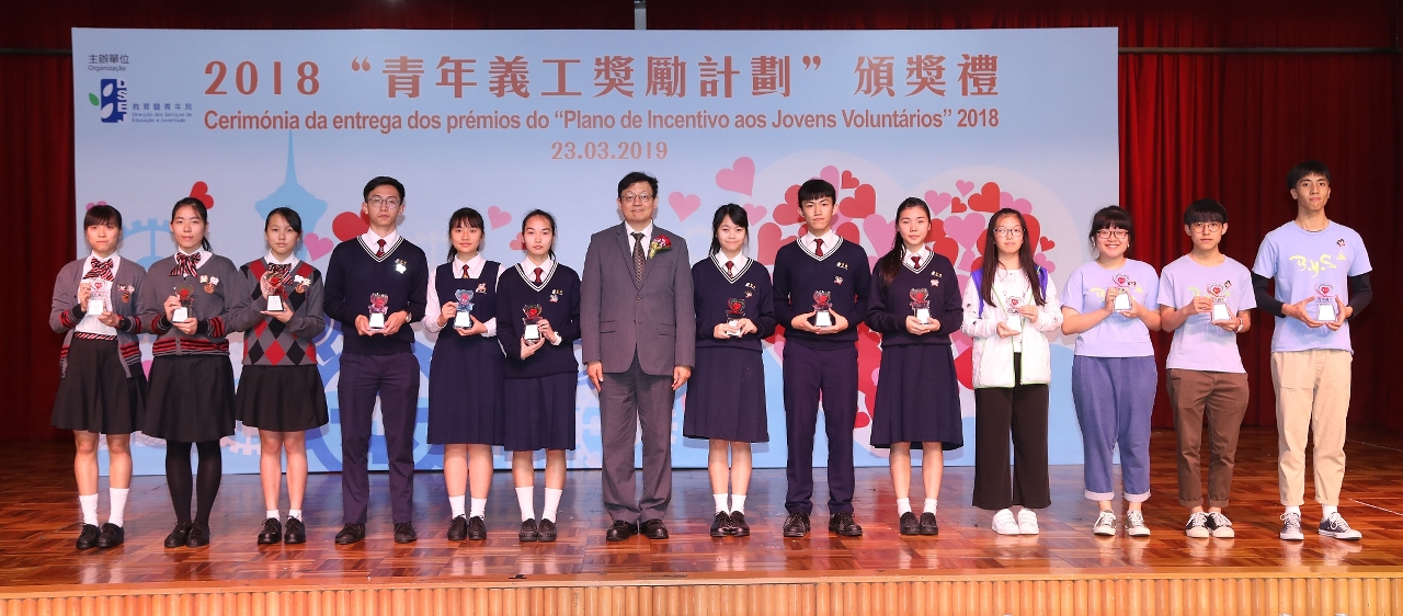 由教育暨青年局主辦的2018“青年義工獎勵計劃”頒獎禮於2019年3月23日(星期六)下午假澳門浸信中學舉行。活動旨在表揚及肯定青年義工對社會的承擔和貢獻,進一步推動青年義工積極參與義務工作,並鼓勵社會各界和青年加入義工行列,發揚守望相助的精神,共同為澳門社會注入正能量。出席今屆頒獎禮的有教青局局長老柏生、副局長梁慧琪及代副局長黃健武,加入該計劃的公共部門及公營機構代表,社會團體代表,學校代表和一眾青年義工。約400人出席活動。
