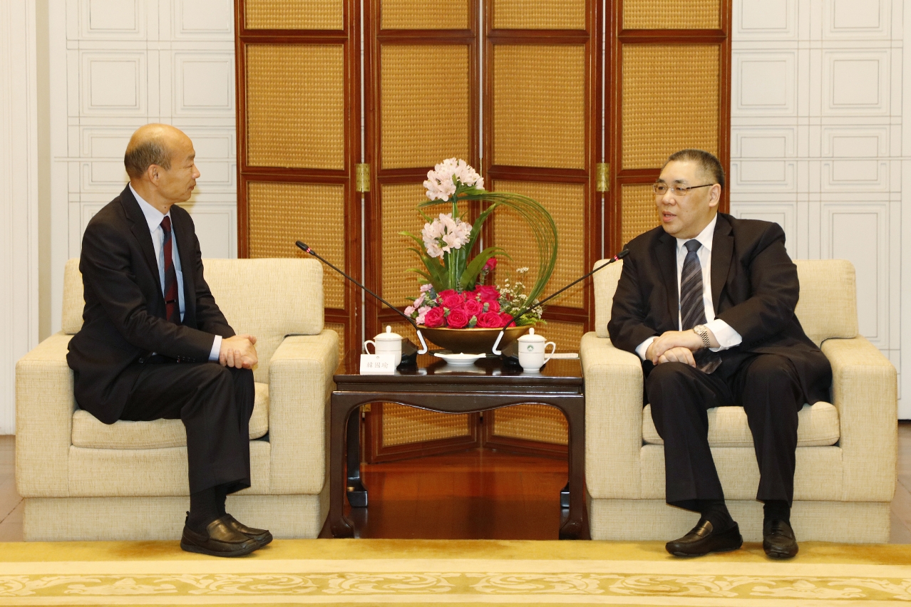 韓國瑜表示感謝行政長官和夫人撥冗會見。他表示,目睹澳門社會經濟發展快速,相信高雄市和澳門具有很大的合作潛力,尤其在高雄市農產品走出去方面,希望今後可以與澳門加強經貿往來,同時促進旅遊、文化等方面的合作。