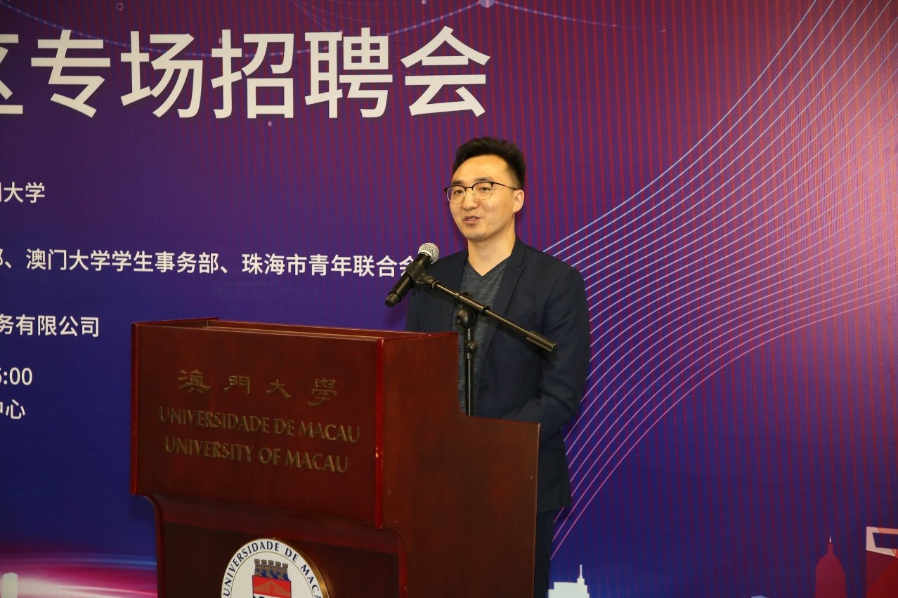 澳大副校長(學生事務)蘇基朗致辭時表示,去年澳大與橫琴新區澳門事務局合作,為學生提供了到橫琴實習的機會,學生也在實習中充分了解到橫琴的發展狀況以及未來的機會。今天的招聘會更是為想要在橫琴發展的澳大學生提供了一個更直接、有效的平台。他續表示,澳大一直不遺餘力地投放資源,發揮澳門作為大灣區的世界旅遊休閒中心、中國與葡語國家的商貿合作服務平台的定位,為大灣區輸出優秀人才。而橫琴就是許多澳大人在大灣區的落腳點,這與橫琴出台各種惠澳政策、良好的就業創業氛圍息息相關。