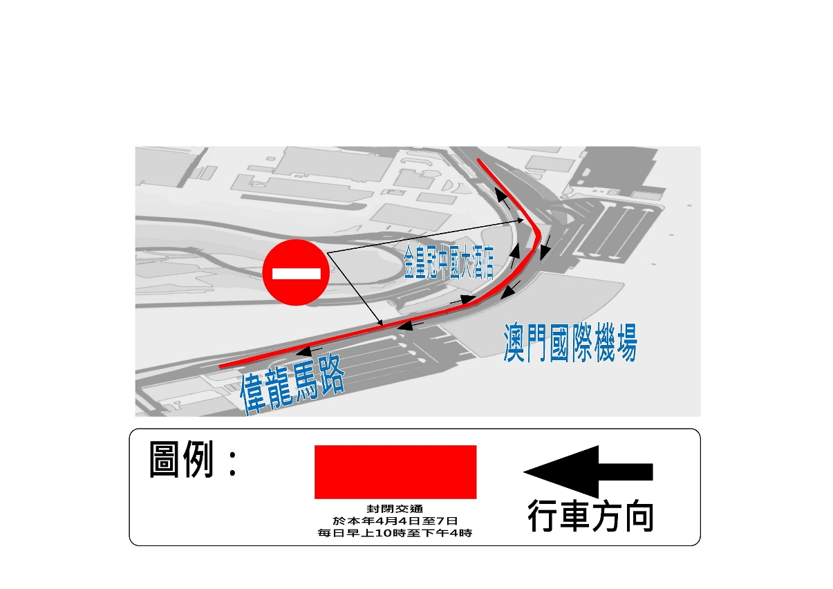 配合輕軌工程維修路面及渠蓋,4月2日(周二)起一連兩日,近氹仔金皇冠中國大酒店一側的偉龍馬路(往北安圓形地方向)實施有限度通車;4月4日(周四)至7日(周日)每日上午10時至下午6時,介乎酒店斜路與澳門國際機場污水處理站的一段偉龍馬路(往飛機場圓形地方向)實施封閉交通,其間,車輛可以經機場客運大樓前的行車天橋或天橋下層之通道行駛。交通事務局呼籲駕駛者留意。