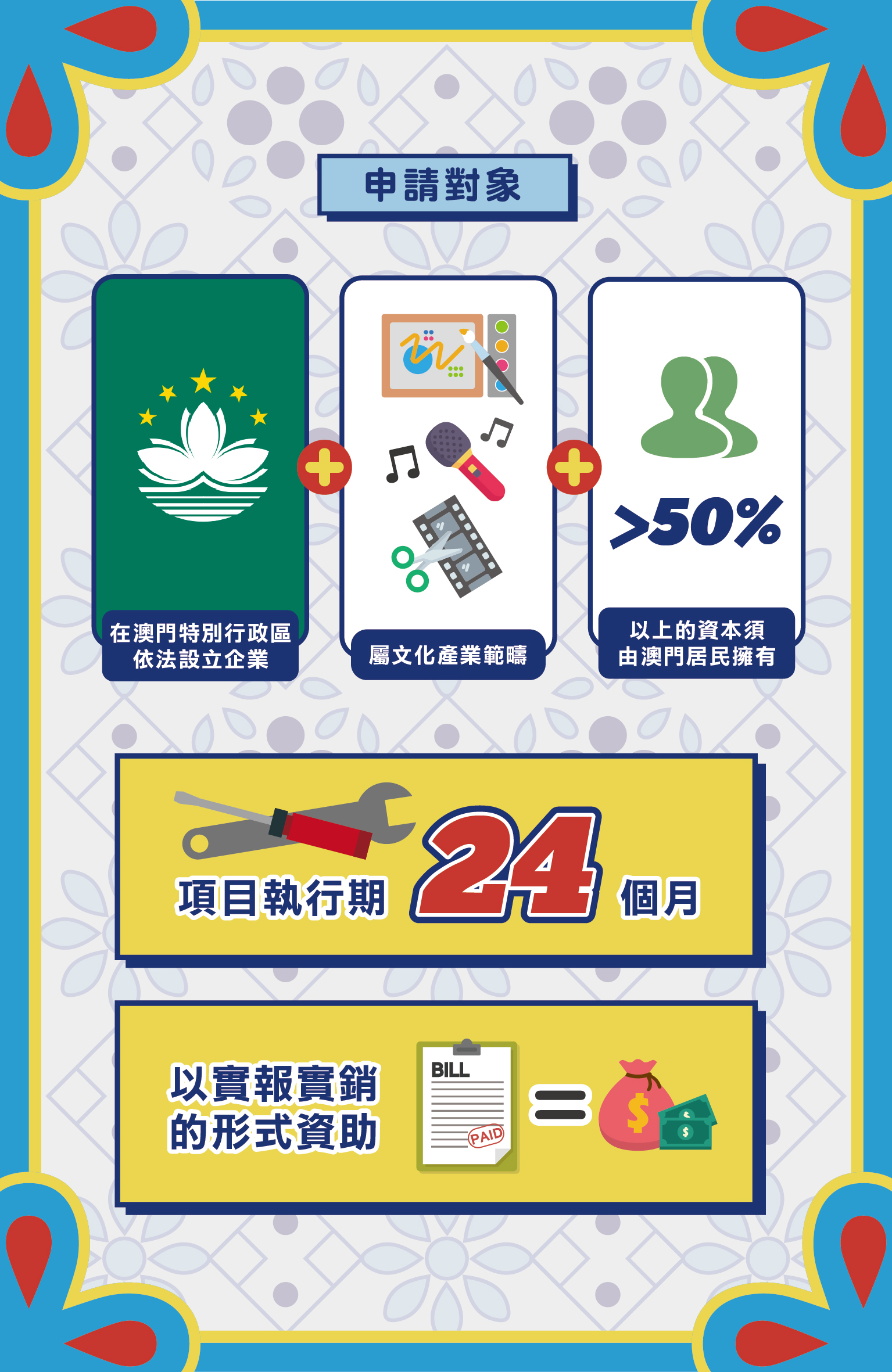 配合澳門建設為世界旅遊休閒中心,鼓勵澳門文創企業挖掘澳門的文化元素,開發新的文化旅遊產品和體驗服務,文化產業基金與旅遊局合作,以澳門旅遊吉祥物“麥麥 Mak Mak”為主題,推出文化旅遊品牌塑造專項資助計劃。申請項目必須有澳門文化旅遊元素,根據“麥麥 Mak Mak”的設計概念,以及旅遊吉祥物推廣澳門旅遊業的宗旨,推出文化旅遊產品或開發澳門的文化旅遊體驗服務。