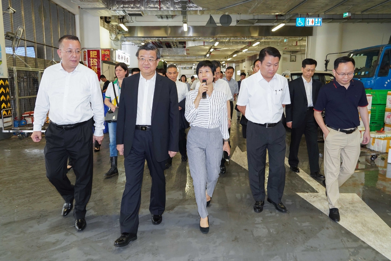 由國家海關總署署長倪岳峰率領的代表團,在市政署市政管理委員會主席戴祖義、副主席李偉農、委員吳秀虹及相關部門主管陪同下,於六月十八日到澳門新批發市場視察。人員向代表團介紹了供澳蔬菜、水果以及禽蛋的進口與檢驗檢疫工作、食品和農產品溯源機制、批發市場的日常運作以及內地食品入口本澳後須經過的檢驗檢疫程序等。倪岳峰亦與批發市場內的商戶進行交流,了解供澳蔬果與禽蛋的貨源、數量以及保障食品安全相關的保質保鮮技術等。