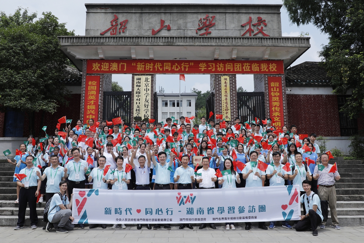 另外, 50名澳門中學生在社會文化司司長譚俊榮、中聯辦副主任薛曉峰帶領下,在韶山學校與當地學生交流。兩地學生各自帶着小禮物在韶山學校操場展開了交流。譚俊榮與當地學生親切交談,詢問了學生的學習和生活情況。