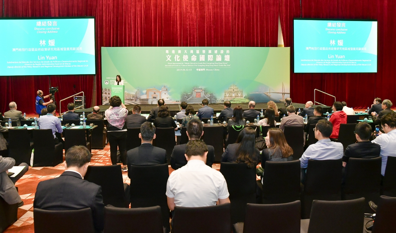 2019年8月13日,由澳門特別行政區政府主辦的粵港澳大灣區發展建設的文化使命國際論壇於澳門君悅酒店閉幕。在為期一天半的會議議程中,來自十多個國家、地區和本澳的共六十餘位專家學者圍繞粵港澳大灣區發展建設的文化使命這一主題,開展了內容豐富、氣氛熱烈的交流研討,提出了許多具建設性的意見建議,論壇取得圓滿成功。