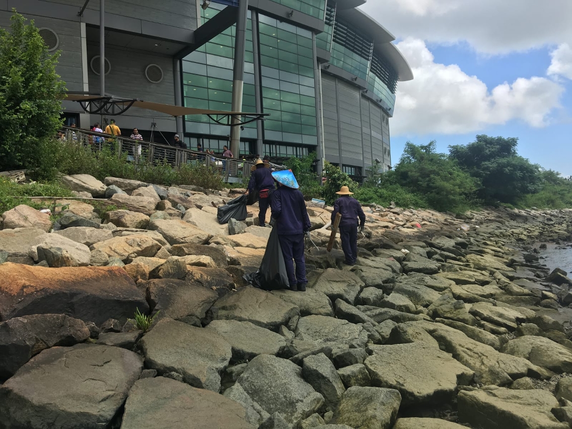 今日的潮汐上午至中午的預測潮高最低只有約一米,沿岸石灘和石堤有大部分面積露出水面,有利開展沿岸垃圾的清理工作。為此,海事局協調海上清潔的外判公司清理觀光塔至西灣大橋一帶沿岸石灘和石堤上的垃圾。清埋的垃圾主要包括木頭、竹枝等植物,同時亦有生活垃圾,包括塑膠等,當中更有冰箱等大型生活用品。今日上午在石灘和石堤上共清理了約2噸垃圾。