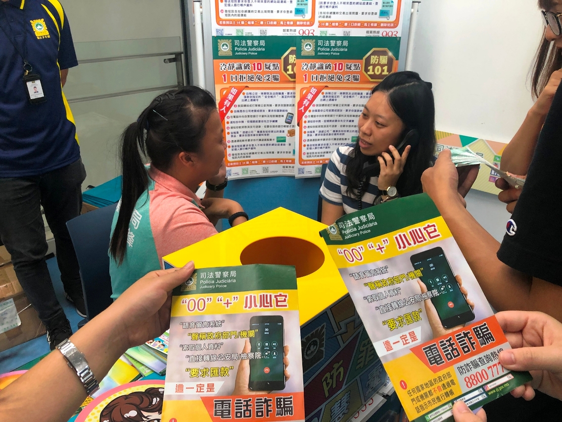 此外,司警局人員亦組織了“社區安全青年領袖計劃”及“滅罪小先鋒種子計劃”的學員,一同到澳門大學校園內設置攤位宣傳提防電話詐騙,並向師生派發防騙宣傳單張,講解最新的電話詐騙手法和預防方法,以及即場邀請學生參與“防罪智慧囊”遊戲和模擬電話騙案重演。司警局希望透過青少年間的相互良性影響及互動宣傳方式,加深師生們對電話詐騙手法的瞭解和記憶,從而提高警惕,同時鼓勵他們將防罪滅罪訊息與親友分享。