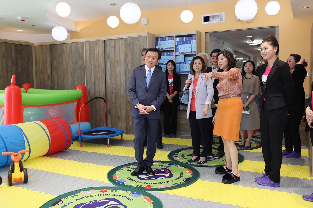 隨後,譚俊榮一行視察同位於日昇樓的崇專托兒所,參觀托兒所的活動室、幼兒單車徑、廚房、多用途室、圖書閣等,譚俊榮詳細了解托兒所的服務宗旨、服務特色、收托安排及人力資源情況,讚揚該所引入智能科技,方便家長和所方溝通;提供中、英、葡三語的培育安排,以及透過探索設備及環境引發兒童學習的動機等。該所本年9月16日起已投入服務。