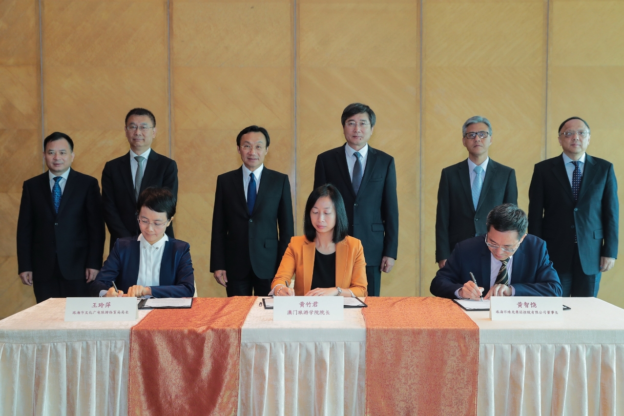《建設澳門旅遊學院粵港澳大灣區旅遊教育合作中心框架協議》簽署儀式於10月15日假澳門旅遊塔舉行。在社會文化司司長譚俊榮、國家文化和旅遊部副部長張旭、澳門中聯辦副主任姚堅、社會文化司司長辦公室主任葉炳權、廣東省文化和旅遊廳副廳長張奕民、珠海市副市長閻武見證下,由澳門旅遊學院院長黃竹君、珠海市文化廣電旅遊體育局局長王玲萍、珠海市珠光集團控股有限公司董事長黃智饒代表所屬機構簽署協議。
