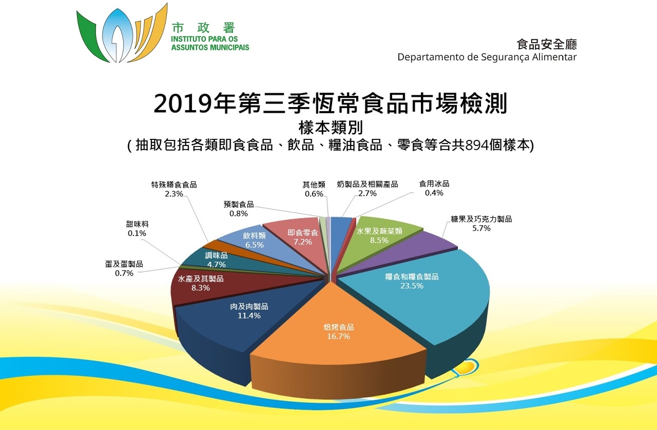 市政署持續透過恆常的食品監察及檢測機制,評估市面售賣食品的風險及衛生狀況。市政署食品安全廳在本年第三季抽取了八百九十四個食品樣本進行檢驗,整體合格率達99.9%。