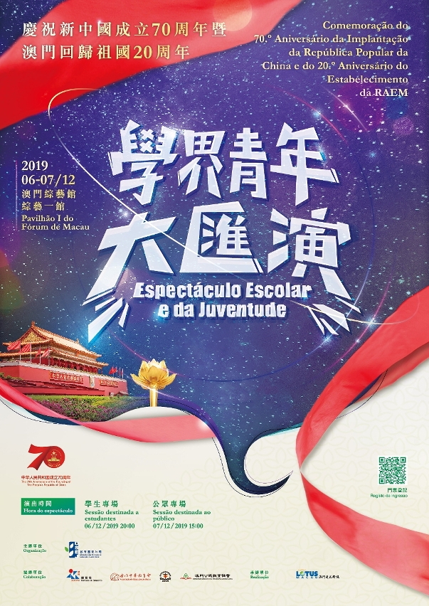 教青局在今年7至9月成功舉辦「藝文薈澳」三大國際青年藝術節慶活動(國際青年舞蹈節、國際青年音樂節及國際青年戲劇節)的基礎下,在今年12月回歸紀念日前夕,教青局將於12月6日及7日假澳門綜藝館舉辦雙慶壓軸藝術活動 ─ 慶祝新中國成立70周年暨澳門回歸祖國20周年學界青年大匯演(下稱“學界大匯演”)。其中12月7日為公眾專場,歡迎市民在網上作門票登記,以索取門票。