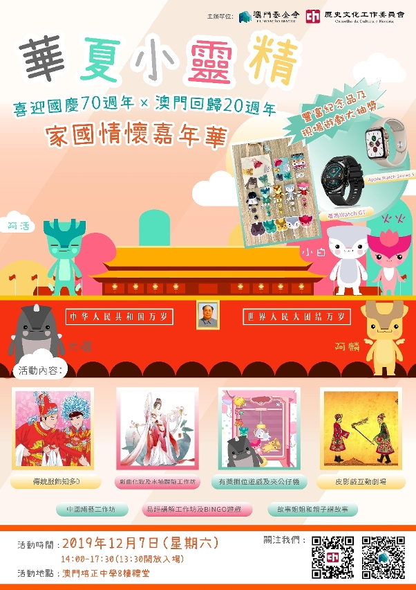 為慶祝中華人民共和國成立70周年暨澳門回歸祖國20周年,促進市民對中華及本土歷史文化的認識,澳門基金會及其歷史文化工作委員會於本年12月7日(星期六)下午2:00-5:30於培正中學舉辦“喜迎國慶70週年 X 回歸20週年─華夏小靈精家國情懷嘉年華”,透過攤位遊戲、工作坊、展示等形式,靈活生動地介紹中華文化及雙慶相關主題內容,加深市民對祖國的認識,了解澳門回歸前後的變遷。