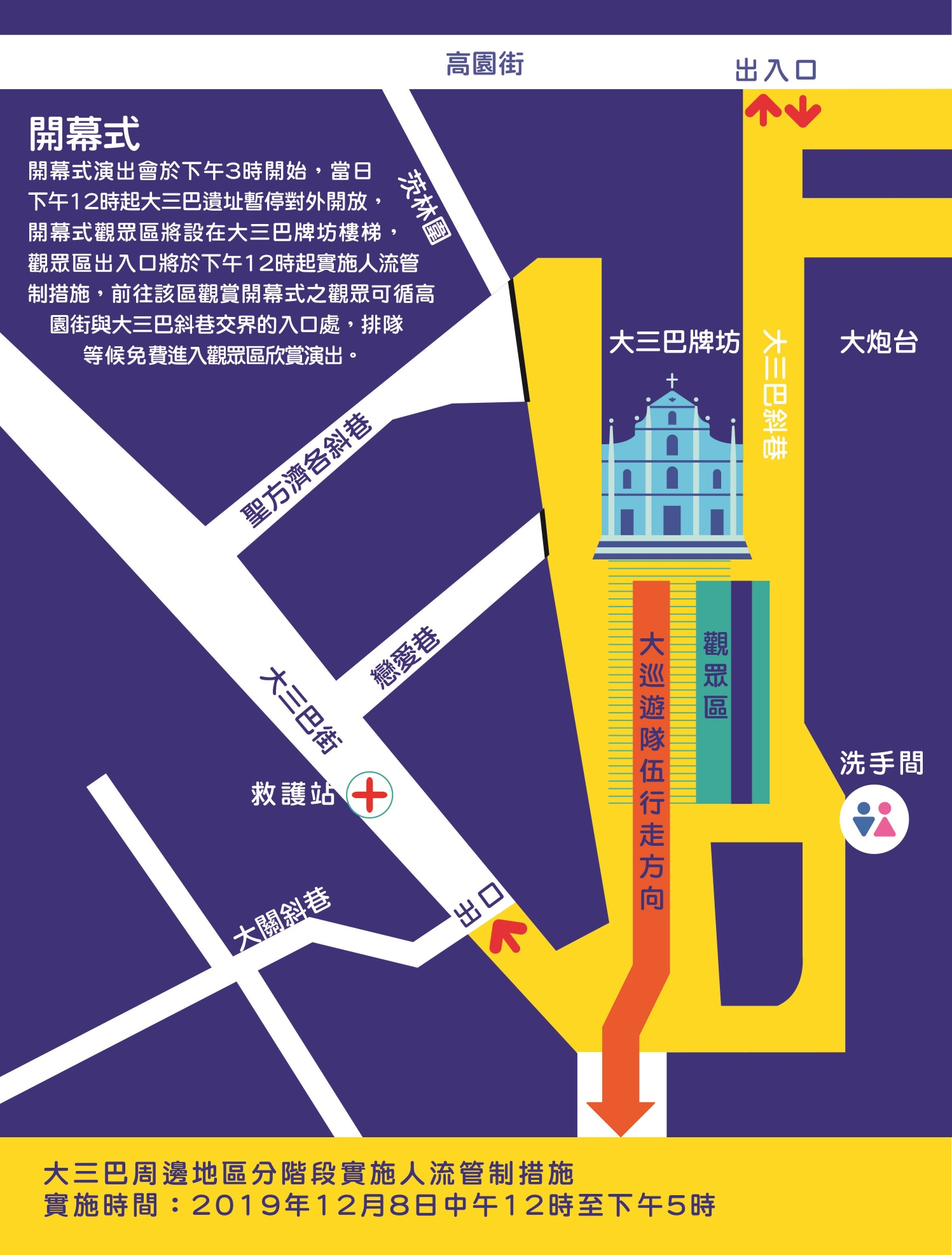 大巡遊舉行當日之觀眾入場指引如下:當日中午12時起大三巴遺址將暫停對外開放。開幕式觀眾區將設在大三巴牌坊樓梯,觀眾區出入口將於中午12時起實施人流管制措施,前往該區觀賞開幕式之觀眾可循高園街與大三巴斜巷交界的入口處,排隊等候進入觀眾區欣賞演出;回歸慶典安排在西灣湖廣場舉行,場內觀眾區將於下午3時起實施人流管制措施,觀眾可循何鴻燊博士大馬路與西灣湖廣場交界之入口處、以及觀光塔街與西灣湖廣場交界之入口處排隊等候進入觀眾區欣賞演出。由於上述觀眾區位置有限,排隊等候之觀眾可於場內人數未滿時獲安排進場。除開幕式及回歸慶典外,觀眾亦可選擇於南灣湖景大馬路欣賞巡遊隊伍的沿途表演。