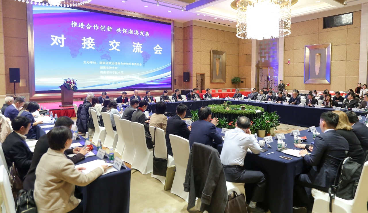 下午,訪問團出席“推進合作創新 共促湘澳發展”對接交流會,與湖南省政協李微微主席、湖南省陳飛副省長、湖南省政協胡旭晟副主席,以及當地多所高校校長、相關科研機構及企業負責人等進行交流。
