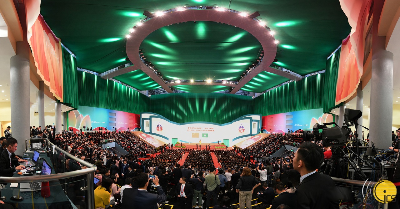 慶祝澳門回歸祖國20周年大會暨澳門特別行政區第五屆政府就職典禮”今(20)日上午10時在澳門東亞運動會體育館隆重舉行,現場氣氛莊嚴熱烈,出席典禮的嘉賓約有1100人。