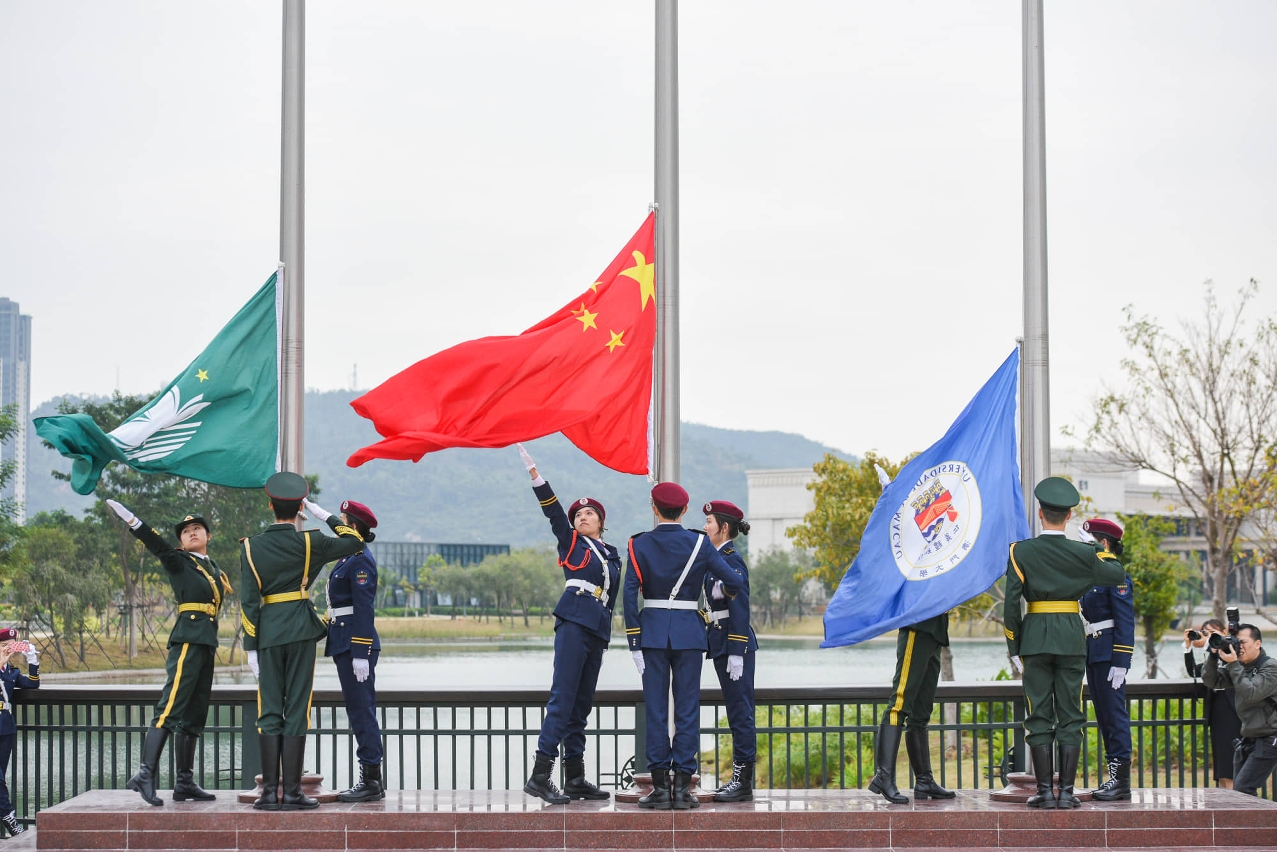 早上8時正,由澳門大學國旗儀仗隊、清華大學國旗儀仗隊、浙江大學寧波理工學院國旗護衛隊組成的升旗方隊穿著整齊的制服,邁著鏗鏘的步伐,走向升旗台。當澳大管樂團奏響起國歌時,三校隊員同時把國旗、區旗和澳大校旗抛向藍天,冉冉升起。