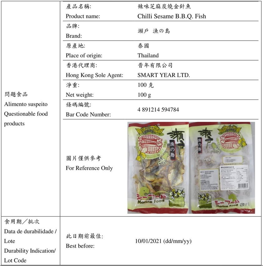 市政署恆常於本澳各零售點抽取食品樣本進行檢測,期間發現一款名稱為“辣味芝麻炭燒金針魚”的預包裝零食樣本含每公斤一千九百二十毫克的防腐劑山梨酸,其含量超出本澳第7/2019號行政法規《食品中防腐劑及抗氧化劑使用標準》之規定。涉事產品的產地為泰國,淨重一百克,該批次所標示之“此日期前最佳”為2021年1月10日。
