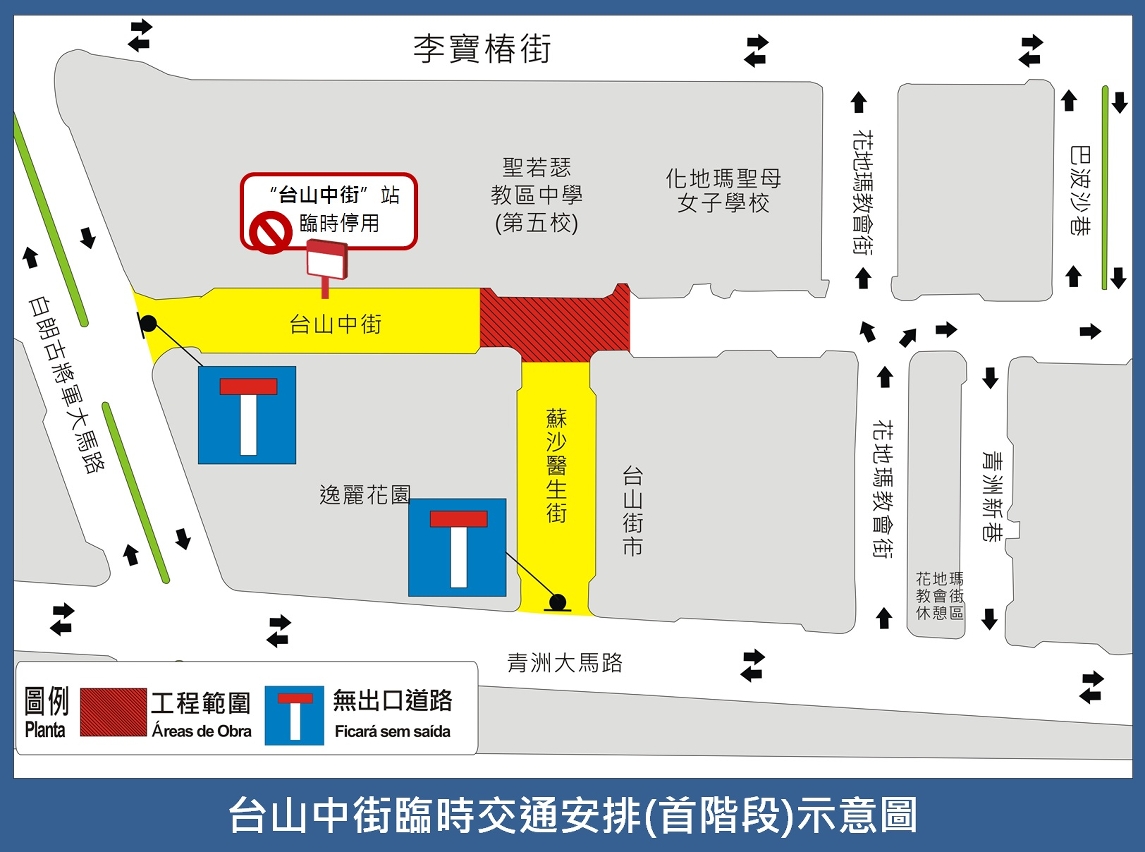 配合施工,交通事務局分階段實施臨時交通安排,首階段由3月16日(周一)上午10時至4月4日(周六),蘇沙醫生街與花地瑪教會街之間一段台山中街封閉交通;蘇沙醫生街、白朗古將軍大馬路與蘇沙醫生街之間一段台山中街臨時改為無出口道路。9(往媽閣)路線巴士改道行駛,並臨時不停靠“台山中街”站,乘客可使用鄰近的“三角花園”站上落。