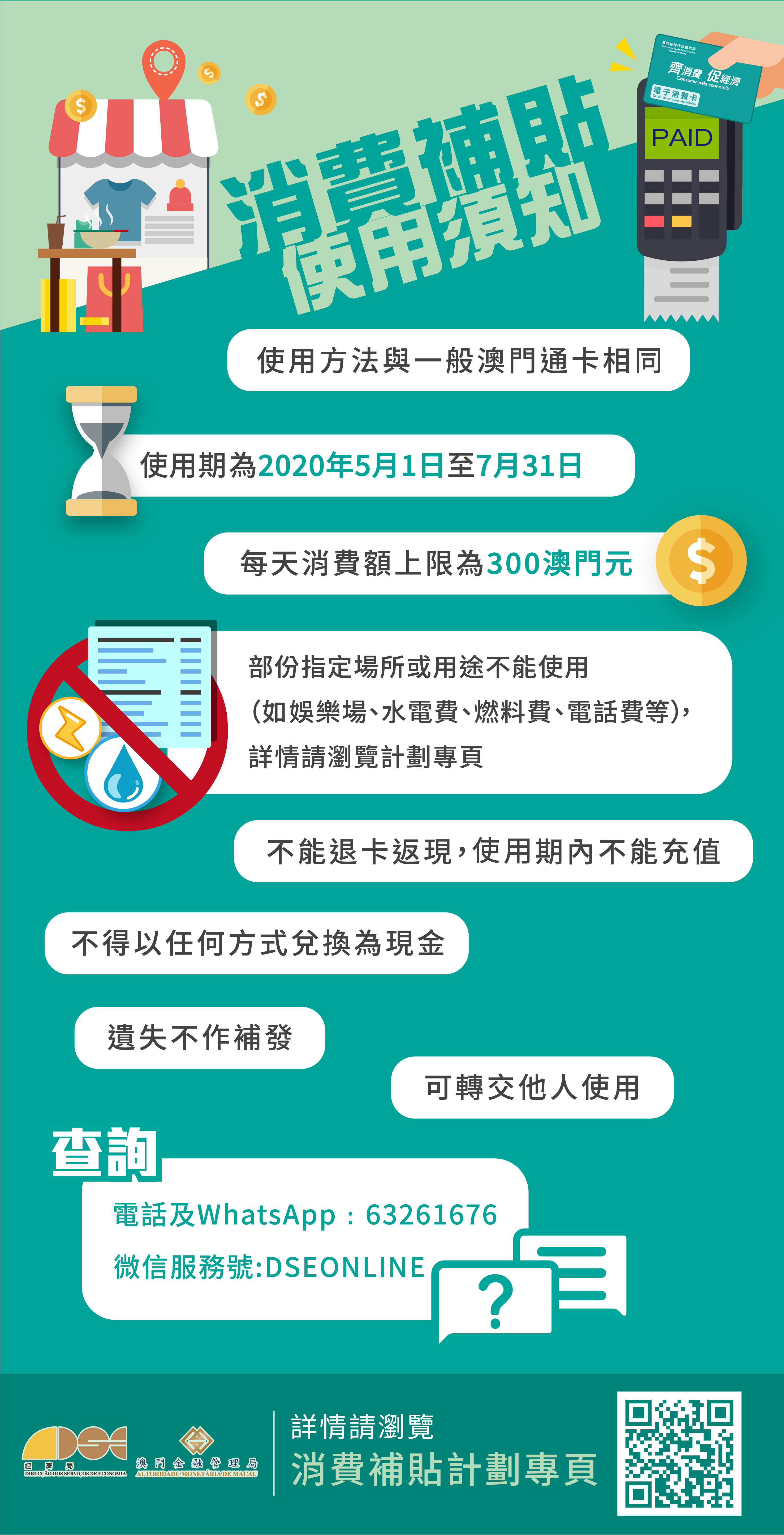 - 市民亦可透過Whatsapp (6326 1676)、微信服務號(“經濟局服務在線”/“DSEONLINE”)或電郵(consumo@economia.gov.mo)等線上方式查詢計劃的相關資訊。