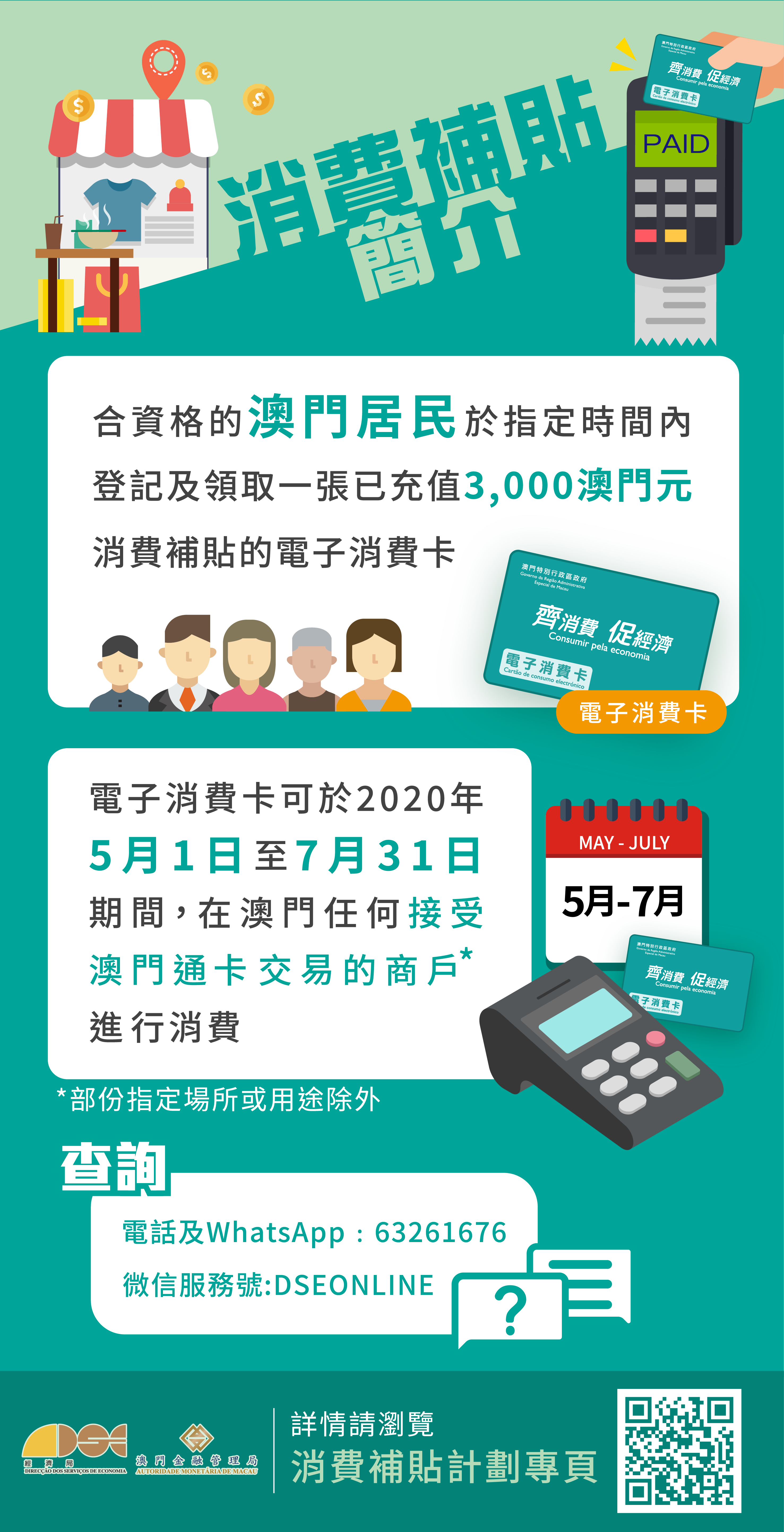 - 領卡地點及辦公時間等計劃詳情已上載至消費補貼計劃專屬網頁(https://www.economia.gov.mo/consumo/);