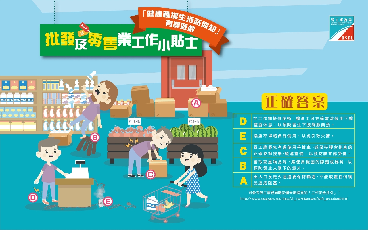 是次遊戲的正確答案和得獎名單已上載至勞工事務局網站https://www3.dsal.gov.mo/retailsafety/,歡迎參閱。得獎者可由即日起至5月15日於辦公時間內,攜同有效澳門居民身份證前往勞工事務局職業安全健康廳服務櫃台(地址:澳門馬揸度博士大馬路221-279號先進廣場二樓)領獎,如有需要亦可委託親友代領(須同時出示由得獎者簽署的澳門居民身份證副本及代領人的澳門居民身份證正本),逾期作廢。如有疑問可致電勞工事務局2871 7781查詢。